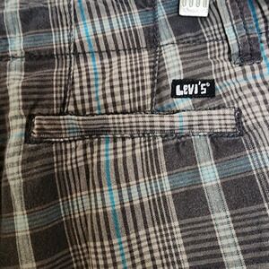 The product is a pair of Youth Levi Gray Plaid Shorts in size 14 with a Flat Front Bermuda style. Made of cotton fabric with a medium wash, these shorts feature a zip closure and a low rise. Suitable for travel, activewear, and casual occasions, they are machine washable and come in a classic gray color. With an inseam of 12 inches, these Levi's shorts are designed for boys and are perfect for the summer, fall, and spring seasons.