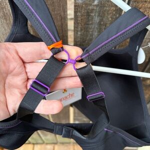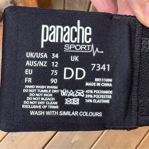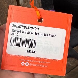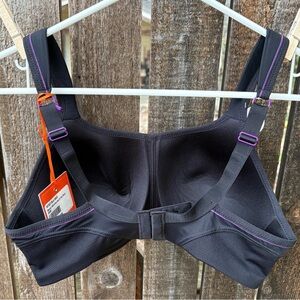 Panache Sport Marvel Wireless Sports Bra In Black with Purple Sz 34DD. New with tags. Adjustable straps with a J-hook to make into racerback. High impact. Wireless with built in sculpted contour cups. Measurements for width is in smallest & largest setting. Great new condition