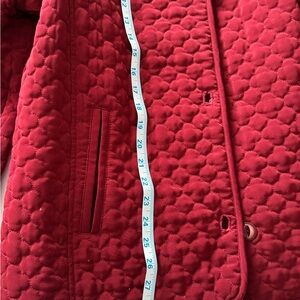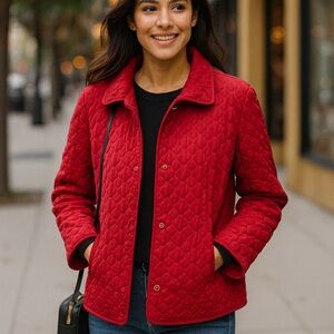 Chic red quilted design. Cozy and stylish for cooler days. Ideal for layering.