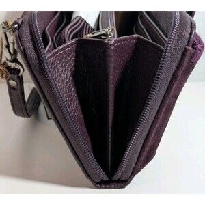 Crafted from premium artisanal leather with suede finish in the rich Aubergine / Suede colorway, this bag features a main zip-around closure and a snap front slit pocket specifically designed to securely hold most smartphones.