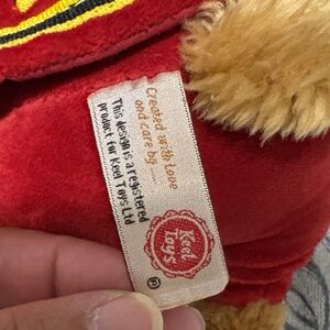 Adorable plush teddy bear dressed in a charming red outfit with a black hat. Perfect for kids to cuddle and play with.