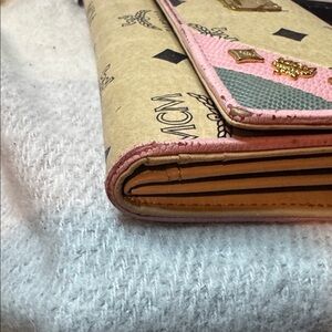 Elegant MCM wallet with pink accents. Features iconic logo and stud details. See all pics