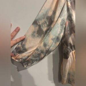 Elegant blouse with a soft tie-dye pattern. Features a V-neck and gathered front. Perfect for a chic look.