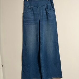 Halara Flex women's high-waisted, pull-on, wide-leg denim jeans! They feature a relaxed, flowing fit that is wide from the hip down, a full elasticated waistband for comfort, and front slant pockets.
