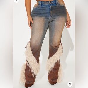 Brown Lace Up Faux Fur Bootcut Jeans - Medium Wash Flare Plus Jeans with Fringe