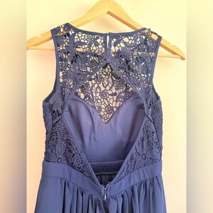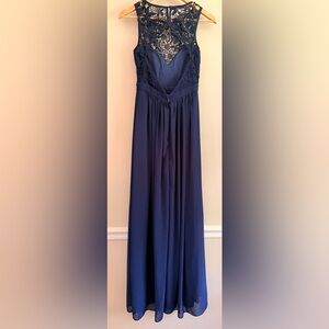 Chic navy blue maxi dress with lace bodice. Perfect for elegant events. This is a preowned dress in great condition! Please check out the pictures for more details and measurements.