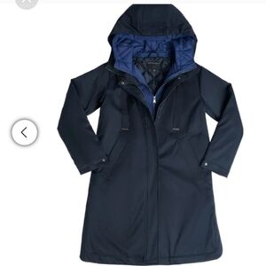 Mid weight with quilted lining, the oversized anorak style is meant to be cinched/adjusted, ordered my regular size small. (Note: the full coat + hood quilted lining is not removable; however, the lighter color small narrow quilted bib insert does zip out.