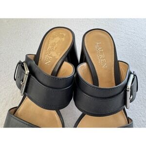 Update your pristine look this season with the LAUREN Ralph Lauren® Farie II sandal. Burnished vachetta leather upper material. Slip-on construction. Open-toe silhouette. Dual straps over vamp flaunt buckled accent. Synthetic lining. Lightly padded, stationary insole. Architectural, stacked chunky heel. Synthetic outsole. Imported. Measurements: Heel Height: 2 3⁄4 in Weight: 12 oz Product measurements were taken using size 9.5, width B - Medium. Please note that measurements may vary by size. Weight of footwear is based on a single item, not a pair.