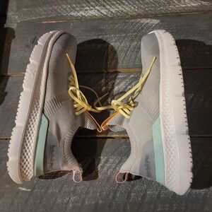 Please see photos for details. Shoes have try on wear. See photo of the bottoms. New in box. Lightweight.