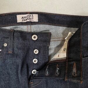 Naked & Famous Blue Super Skinny Guy Stretch Selvedge Denim Jeans Sz 32 Japanese. See pictures for approximate measurements. Jeans are gently worn and in excellent, like new condition.