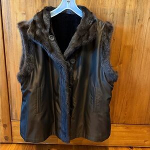 David Green reversible sheared mink vest with long hair trim around the collar and arm holes and a tuxedo front. This vest is like new condition. This vest can be worn dressed up or more casual. This is a generous fit.