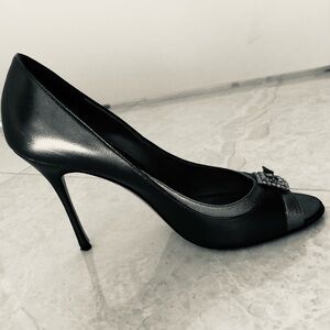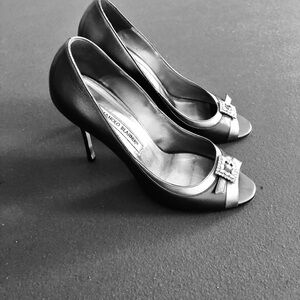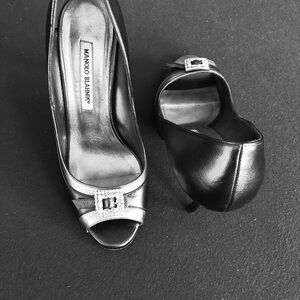 Manolo Blahnik silver stiletto peep-toe heels. Sleek design with elegant crystal buckle and grey embellishment.