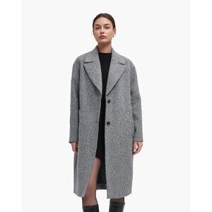 Notch lapel collar, below-the-knee length, long sleeve with drop shoulder, single-breasted front, 2 side entry pockets for hand