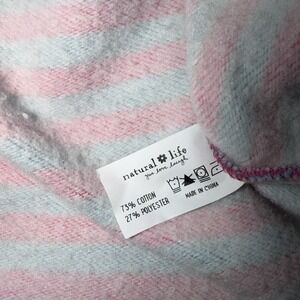 This Natural Life women's oversized crewneck striped sweatshirt is preowned and in excellent condition. This has minimal wear. This purple and pink striped sweatshirt with a green ribbed neckline, wrist, and bottom hem has a soft terry feel on the inside. This is made of 73% cotton in 27% polyester and it is machine washable. The approximate measurements are: