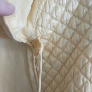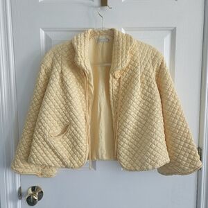 In great vintage condition- only flaws are a small seam rip in the inner back and one of the front 'buttons' that hold the strings is loose. Embrace the classic elegance of the 1950s with this authentic Barbizon Dainty Puff Seraphim Satin Quilted Bed Jacket. The dreamy yellow hue and babydoll silhouette evoke a sense of timeless sophistication, making it a stunning addition to any vintage collection. Designed for those who appreciate the allure of retro fashion, this piece promises to be a distinctive highlight in your wardrobe. Crafted from luxurious satin material, the bed jacket features intricate quilted detailing, offering both comfort and style. Its original design remains intact, showcasing the impeccable craftsmanship from a bygone era. This variation features the top ties instead of buttons. This bed jacket is very Sabrina Carpenter core and would look so cute with a nightgown or even to wear out with a cami.