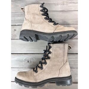 Sorel women's tan suede lace-up combat boots. These boots feature a rugged lug sole for excellent traction and a waterproof construction to keep your feet dry.