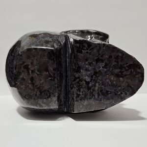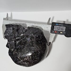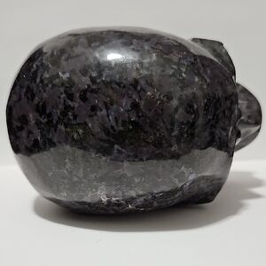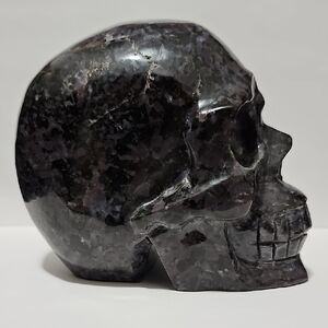 This merlinite skull (also known as indigo gabbro) adds a bold statement to any room. Its intricate design make it a standout addition to your decor.
