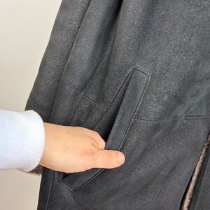 A classic shearling coat with a two way collared neckline, mid length and pockets.