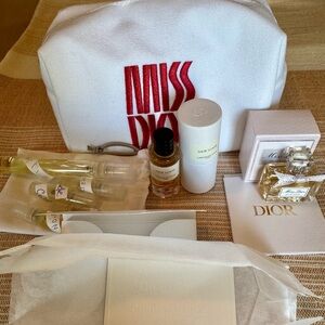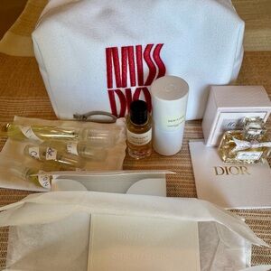 Chic Dior travel set with beauty essentials. Features a white pouch with bold pink logo. Includes small perfumes and skincare items nice to take when traveling