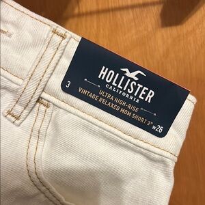 These Hollister white jean shorts feature a high-waisted design with a raw, frayed hem for a trendy, distressed look. Crafted from durable denim, they offer a stylish and casual vibe perfect for everyday wear.
