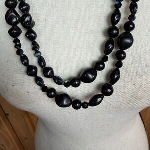 It's a long, elegant single-strand necklace featuring a mix of matte and glossy black beads in round, oval, and faceted geometric shapes. It's Interspersed with faceted Aurora Borealis (AB) beads that catch the light with a subtle iridescent shimmer. It has matching cluster style clip on earrings. The necklace can be worn as one single long one or double up. It's in good pre-owned condition