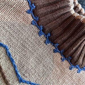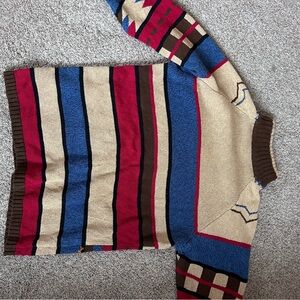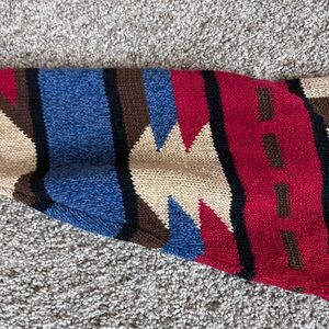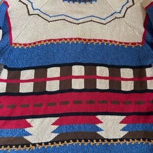 This is a gorgeous vibrant vintage sweater. Southwestern tribal print. Great western color palate. It is longer in length. There is one flaw on back of right elbow. It isn’t a hole as it doesn’t go all the way through sweater, but the start of one. There are a few loose threads in the decorative stitching. Otherwise this is in excellent condition. Colors are vibrant. No pilling.