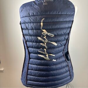 Brand new with tags Tommy Hilfiger packable lightweight puffer vest in navy blue, size Small. Features a stylish metallic gold Hilfiger signature on the back, full zip front, and two zip pockets. Crafted from 100% nylon shell and lining with a 100% polyester fill for warmth without bulk.