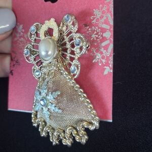 This beautiful golden angel brooch adds a touch of elegance to any outfit. Including Blue rhinestones and a central snowflake, this is Perfect for the holiday season, it features intricate detailing and a shimmering finish. NWT, all questions welcome.