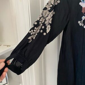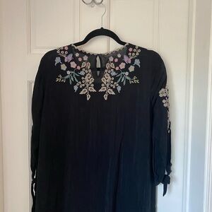 Get ready for spring!! Chic black dress with colorful floral embroidery. Long sleeves with tie details. Comes to just below the knee. Perfect for 3 season wear!