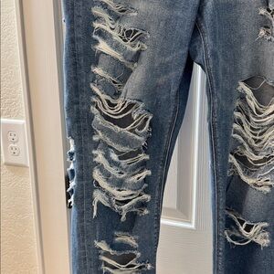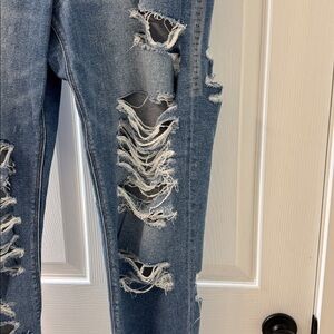 Stylish distressed women's jeans in a classic blue shade. Perfect for a casual, trendy look.
