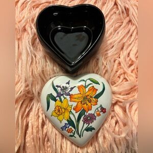 A beautiful small heart shaped trinket box, made by Otagir Japan, featuring lovely spring flowers of Lilies, and daffodils. Trinket dish is in excellent vintage shape, no chips or cracks