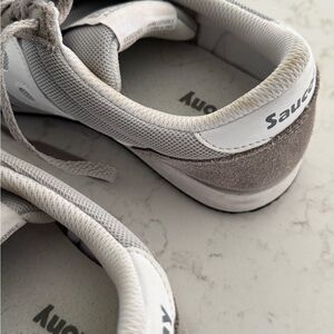 Comfortable Saucony running shoes in gray and white. Ideal for everyday activities. Size 7.5. Gently used, can easily be waged in the machine and air dried. Smoke free home.