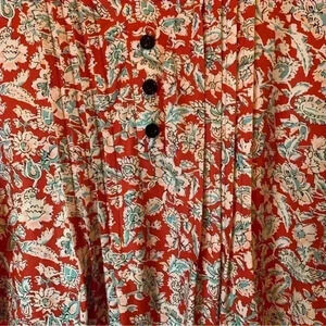 Armpit to pit is about 26 inches. Length from shoulder is about 31 1/2 inches. Pleated in front. 3 buttons in front. Bell short sleeves.