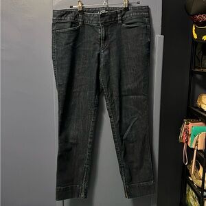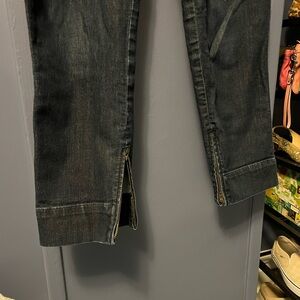 Chic dark blue wash jeans with a cropped ankle length. Zippers on the inside ankle give the pants a low key individualized look. Can be dressed up or down, no rips stains etc