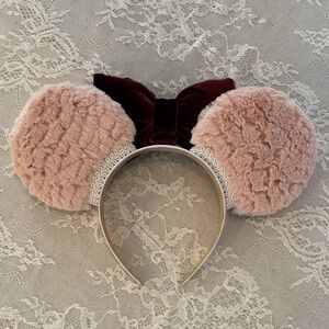 Dainty Coquette Plush Blush Pink Minnie Ears Headband with Burgundy Velvet Bow