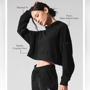 Chic, minimalist ribbed hoodie by Alo Yoga in classic black. Features Alo’s signature wide ribbed fabric, cropped silhouette, structured hood, and logo patch at the sleeve. Super flattering and perfect for athleisure, yoga, or everyday wear.