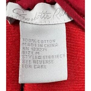 This is a Charlotte Russe sleeveless red top in size M. It features embroidery detailing, a round neck, and a pullover closure. Made of 100% cotton knit fabric, this blouse has fringe and bow accents. It is lightweight, sheer, and breathable, suitable for various occasions like parties, casual outings, or formal settings in the summer or spring. Easy to care for with machine washable instructions.