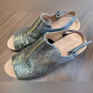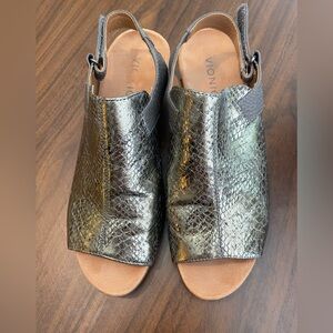 VIONIC Tatiana Adjustable Peep Toe Wedge Sandal in Metallic Pewter Snake Embossed Leather