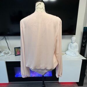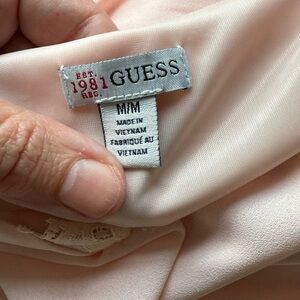 Elegant and feminine Guess bodysuit in a soft peach shade. Features a stylish V-neck with lace detail, long sleeves, and a blouse-style top for a classy, flowy look. Bottom closure with snap buttons for comfort and easy wear. Perfect to pair with jeans, skirts, or dress pants for work, going out, or special occasions.