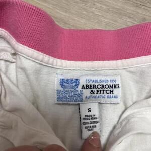 Y2k Abercrombie & Fitch white polo shirt with pink collar and blue trim.