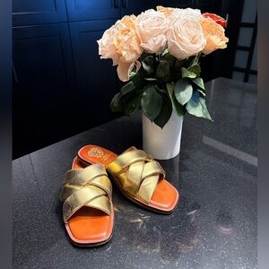 Step into elegance with these Vince Camuto gold slide sandals. Perfect for any occasion, these sandals offer both style and comfort.