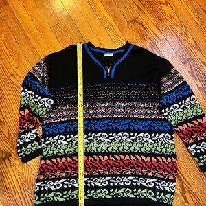 Stay warm with this gorgeous, thick, soft vintage sweater. Featuring a beautiful pattern in a mix of black, blue, green, red, and white. Cute zipper design. Size tag is missing but it’s an oversized L/XL, very roomy and long. See photos for measurements. In excellent condition with no holes, stains, or pilling. From a smoke free home. Open to all reasonable offers!