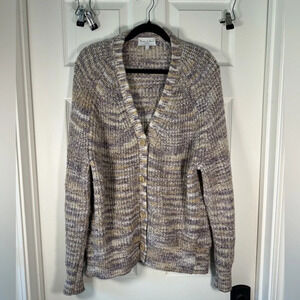 Causal tropical men’s shirt features a leaf print with a full guitar print within the fabric, single pocket, full button closure, relaxed fit in excellent condition.