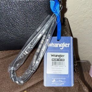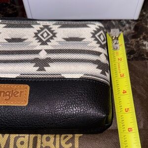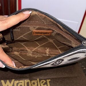 Wrangler wristlet clutch with a striking geometric design. Features durable materials and a sleek look.