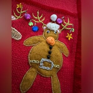 Quacker Factory Vintage Zip Up Reindeer Red Cardigan Sweater Ugly Christmas Holiday Grannycore Size Small. Such a fun detailed jeweled & beaded fancy holiday sweater! It is trimmed in a chenille like fabric and the bottom is decorated with various jeweled reindeer with decorative ornaments on the antlers. The bottom back of the sweater feature the backside/butts of the reindeer.