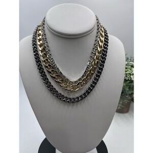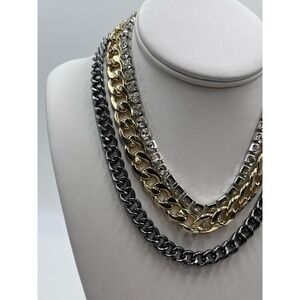 Steve Madden Layered Tri Tone Mixed Metal Bling Stones Curb Chain Necklace New