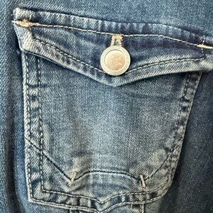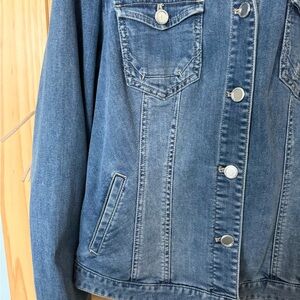 Stylish indigo jean jacket by Chico's. Features button front and chest pockets but the best is the fringe on the back and down back of arms!! So cool! 24 in length , 22 in PTP, 24 in sleeves. No callouts this is an excellent condition. This is a Chico’s size 2, which is around a 12 to 14. Snag this one it will go fast! Smoke free home. Pet friendly, but stored away from pets.