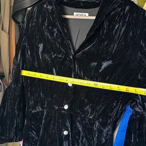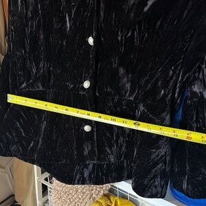 Luxurious black velvet jacket featuring elegant pearl buttons. Ideal for sophisticated style. Has a vintage feel.