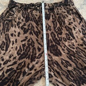 Features a built in belt. Waist band has elastic band in the back. Slide button closure with zipper. In great used condition and such a statement piece. 100% Rayon and perfect for any season. 30” inseam.