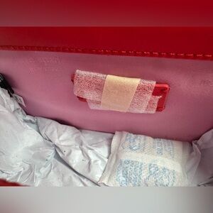 The KATE SPADE "Sticky Situation" Cherry Chewing Gum Handbag/Crossbody is a stylish and compact accessory perfect for on-the-go use. Made of smooth leather with a colorblock pattern featuring red accents, this small rectangular bag is equipped with a detachable strap and a convenient convertible style. The handbag has a fabric lining in pink, adding a pop of color to the overall design. The Kate Spade brand ensures quality and sophistication, making this handbag a versatile choice for both men and women.